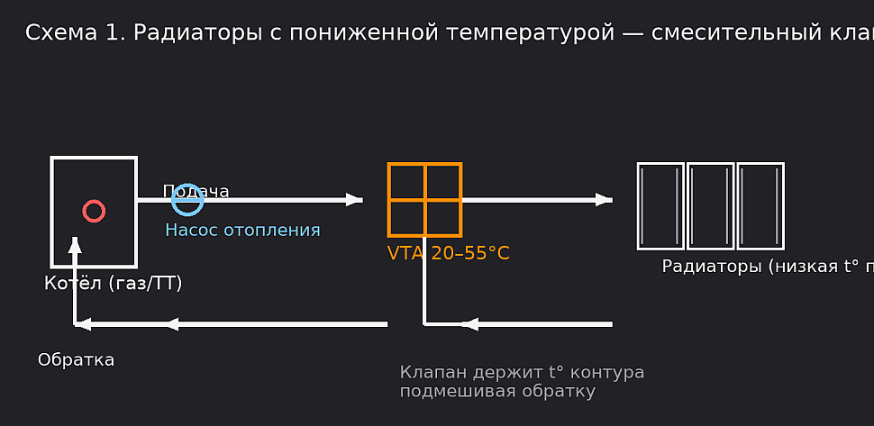 1) Радиаторы + смесительный клапан VTA (комфорт на подаче)