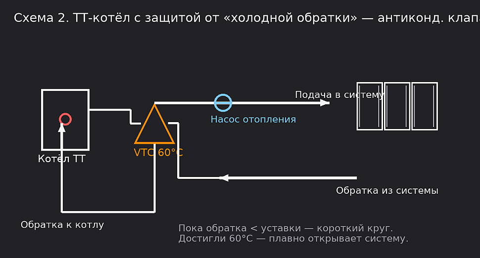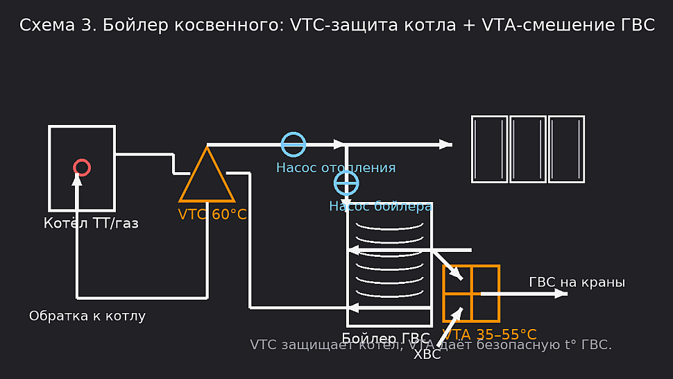 Как это выглядит: котёл → подача → VTA → радиаторы → обратка → обратно в котёл. Клапан по температуре сам «дольёт» горячего столько, сколько нужно.